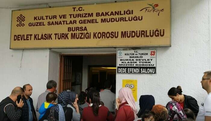 Bursa Devlet Klasik Türk Müziği Korosu Dede Efendi Salonu'nun önünde tiyatro izlemek isteyen çocuklar uzun kuyruk oluşturdu. Sonu bitmeyen ku