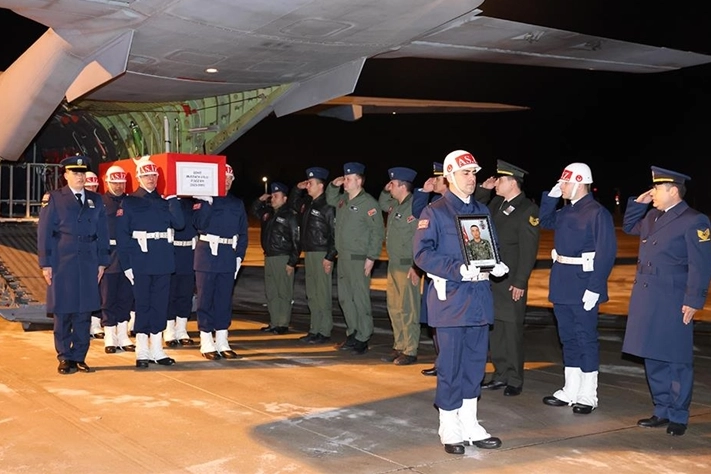 Şehidin Türk bayrağına sarılı tabutunu taşıyan askeri uçak, Amasya Merzifon Havalimanı'na indi.