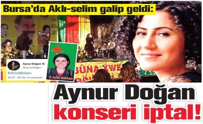 Geçtiğimiz haftalarda Kocaeli'nin Derince ilçesinde vereceği konser AK Partili belediye tarafından iptal edilince özellikle sol basın ve CHP’nin sahip çıktığı PKK sempatizanı Aynur Doğan’ın Bursa’da vereceği konser, Büyükşehir Belediye Başkanı Alinur Aktaş’ın müdahalesi ile iptal edildi. Mülkiyeti Büyükşehir Belediyesi’ne ait olan ve Bursa Kültür Sanat Turizm Vakfı tarafından işletilen Kültürpark Açıkhava Tiyatrosu’ndaki konser için BKSTV yazı gönderen Aktaş, konserin iptal edildiğini bildirdi. Gergedan Yapım adındaki şirketin organize ettiği ve BKSTV tarafından yapılan kiralama iptal edilirken, firmanın halen bilet satıyor olması da oldukça ilginç karşılandı.