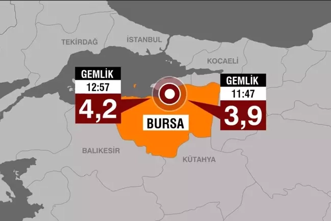 Gemlik ilçesinde saat 11.47'de 3,9 büyüklüğünde ve saat 12.57'de 4,2 büyüklüğünde iki meydana geldi. Afet ve Acil Durum Yönetimi Başkanlığının (AFAD) internet sitesinde yer alan bilgiye göre, merkez üssü Gemlik ilçesi olan 3,9 büyüklüğünde sarsıntı kaydedildi. Çevre illerde de hissedilen depremin 9,82 kilometre derinlikte meydana geldiği belirlendi. Bursa Valiliğinden yapılan açıklamada, "İlimizde saat 11.47'de, merkez üssü Gemlik olan 3,9 büyüklüğünde deprem meydana gelmiş olup, deprem sonrası olumsuz bir durum tespit edilmemiştir. Kamuoyuna saygıyla duyurulur." ifadelerine yer verildi. Gemlik ilçesinde saat 12.57'de 4,2 büyüklüğünde deprem meydana geldi. Afet ve Acil Durum Yönetimi Başkanlığının (AFAD) internet sitesinde yer alan bilgiye göre, merkez üssü Gemlik ilçesi olan 4,2 büyüklüğünde sarsıntı kaydedildi. Çevre illerde de hissedilen depremin yerin 10,14 kilometre derinliğinde meydana geldiği belirlendi. Bursa Valiliğinden yapılan açıklamada, depremle ilgili herhangi olumsuz bir durumun tespit edilmediği kaydedildi.