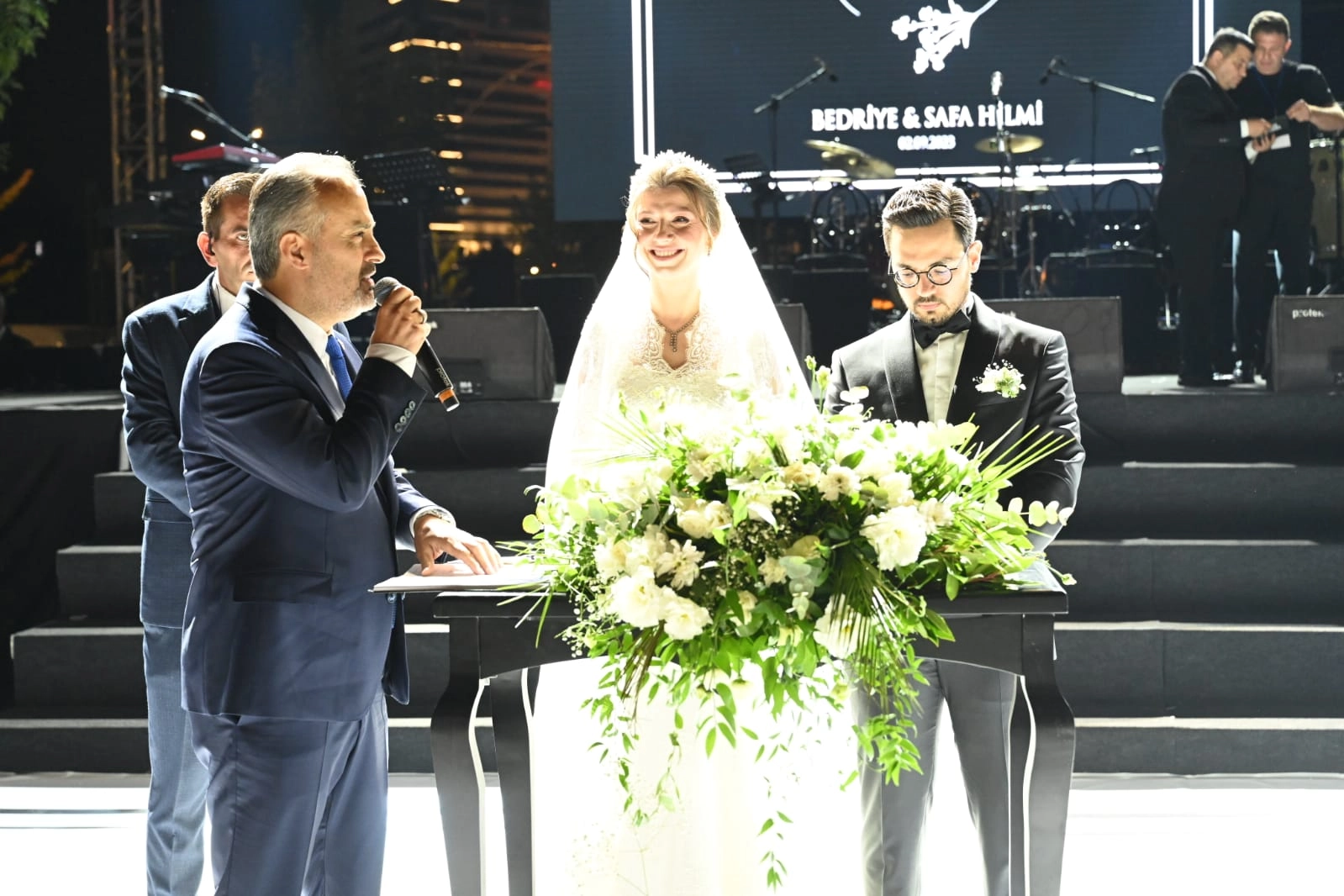 "Bursa Büyükşehir Belediye Başkanımız Sn. Alinur Aktaş'ın kıymetli evlatları Safa Hilmi ile Bedriye çiftimizin düğün törenine katıldık. Çiftimize bir ömür boyu mutluluklar diliyor, Aktaş ve Taç ailelerini tebrik ediyorum."