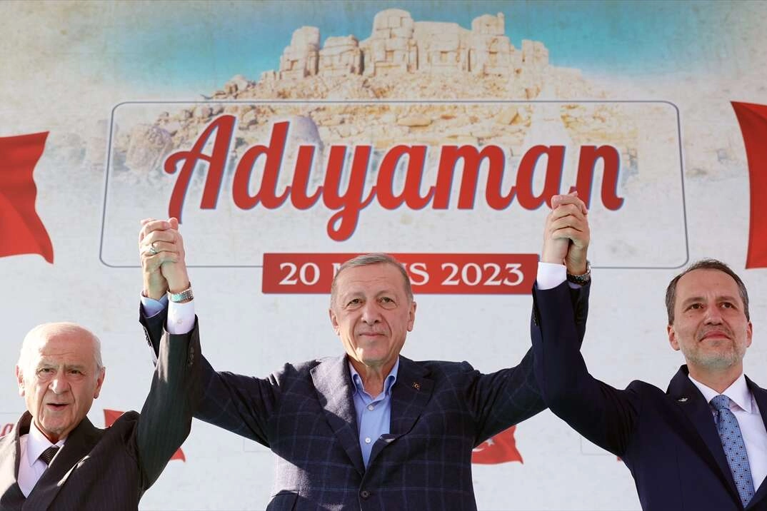 Erdoğan, beraberindeki MHP Genel Başkanı Devlet Bahçeli ve Yeniden Refah Partisi Genel Başkanı Fatih Erbakan ile vatandaşları selamladı.