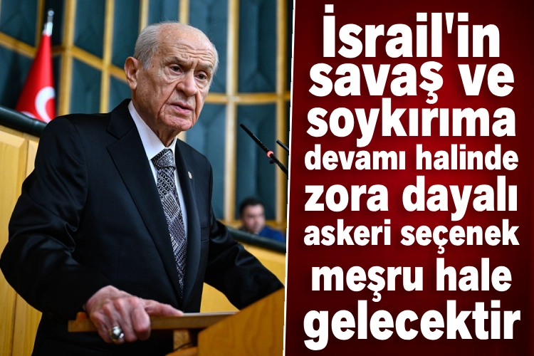 MHP Genel Başkanı Bahçeli, İsrail'in Gazze'ye saldırılarına ilişkin, "Mısır'da müzakerelerin kesintiye uğraması, İsrail'in savaş ve soykırıma devamı halinde artık zora dayalı her türlü askeri seçenek meşru hale gelecektir." dedi.