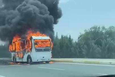 Balıkesir'in Edremit ilçesi Narlı Mahallesi'nde seyir halindeyken alevlere teslim olan yolcu minibüsü kullanılamaz hale geldi.