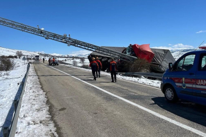 Sivas’ta kontrolden çıkan tır, Elektronik Denetleme Direğine çarpıp bariyerlerde asılı kaldı. Tırda sıkışan sürücü AFAD ekipleri tarafından kurtarıldı.