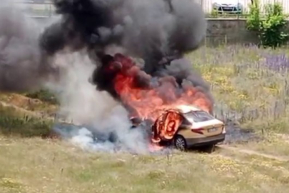 Erzurum'da boş arazide park halinde bulunan taksi bir anda ön kısmından alev aldı ve sonrasında adeta ateş topuna döndü.