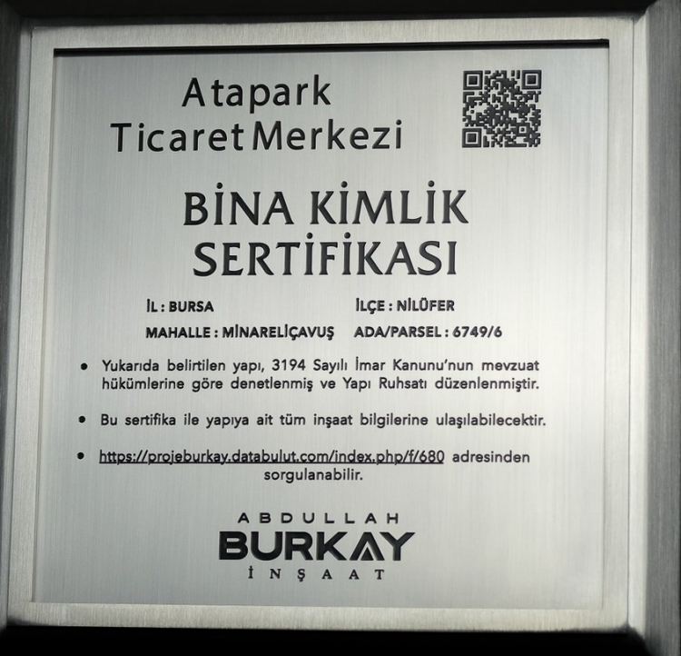 Konu ile ilgili olarak bir açıklama yapan Abdullah Burkay İnşaat A.Ş. Yönetim Kurulu Başkan Yardımcısı İnşaat Mühendisi Tolga Üstünsu “ Binaları teslim ederken verdiğimiz kimlik sertifikalarının üzerindeki kare kod okutulduktan sonra firmaya verdiğimiz özel şifre ile girilen sertifika içinde binanın Mimari, Statik, Elektrik, Mekanik Projeleri, Zemin Etüdü, ÇED Raporu, Ruhsat, Beton Test Raporu, Demir Test Raporu, Yapı Kullanma İzni gibi bütün bilgilere ulaşmak mümkündür” dedi.