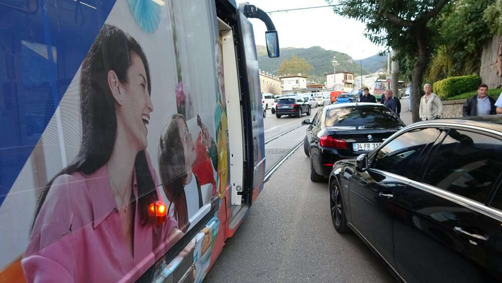 Bursa şehir merkezinde hizmet veren T2 tramvay hattının raylarının üzerine 34 FR 3130 plakalı aracını park eden sürücü uzun süre gelmedi. Tramvayda bulunan yolcular yarım saat araç sürücüsünün gelmesini bekledi. Beklemekten sıkılan yolcular tramvaydan aşağı inip beklemeye başladı. Uzun bekleyişlerinden ardından araç sürücüsü gelmeyince raylardaki araç polis çekici aracıyla çekilerek trafik otoparkına görüldü. Aracın çekilmesinin ardından tramvay yoluna devam etti.