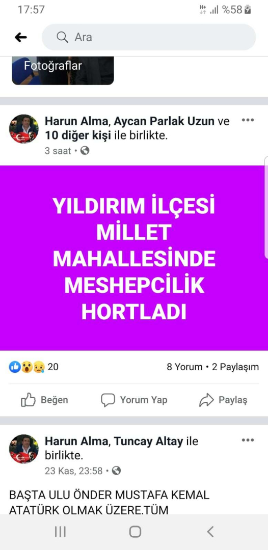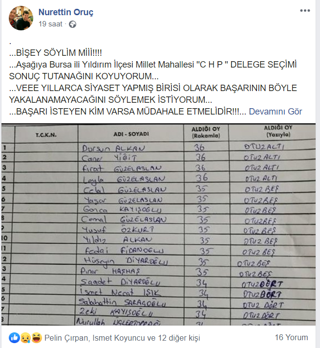 Mezhep siyaseti üzerinden içten içe süren savaş Yıldırım Millet Mahallesi’nde açık açık meydan okumaya döndü. Yıldırım’da Alevilerin organize edilerek delege seçimlerini konsolide etmek için organize olan Orhan Sarıbal ve İlçe Başkanı Nihat Yeşiltaş, bir çok mahallede önemli oranda delegeyi çıkarmayı başardı. 50 bin nüfuslu Millet Mahallesi’nde 180 civarında üyesi olan CHP’nin delege seçimlerine 39 üye katılarak oy kullandı ve delegelerin tamamı 3-4 aileden seçildi. Millet Mahallesi’nde Güzelaslan ailesinden 6, Diyaroğlu ve Alkan ailelerinden 2’şer kişi yer aldı. Kayışoğlu ve ailesinden de isimler delege oldu.