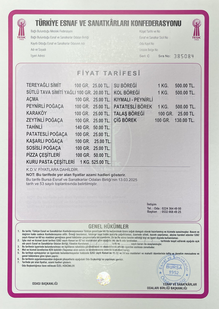 Bursa Simitçiler ve Unlu Madde İmalatçıları Esnaf ve Sanatkarlar Odası, yeni fiyat listesini açıkladı. Ham madde, doğal gaz, kira ve personel giderleri sebebiyle zam yapıldığı belirtildi. Yapılan zammın ardından 100 gram poğaça 20 liradan 25 liraya, 100 gram tereyağlı simit 20 liradan 25 liraya, 100 gram sütlü simit 15 liradan 20 liraya yükseldi. Bursa Simitçiler ve Unlu Madde İmalatçıları Esnaf ve Sanatkarlar Odası Başkanı Erdal Pınar, "Yaklaşık 8 aydır bizim esnafımız zam yapmıyor. Normal şartlarda ocak ayında zam yapılması gerekiyordu. Vatandaşlarımızı da düşünerek 4 ay gecikmeli bu zammı uyguladık. Esnaf kurtarmaz hale geldiği için bu zammı yapmak zorunda kaldık. Çünkü personelinden ununa, şekerinden doğal gazına kadar maliyetler arttı. Bunlar yükseldiği için esnafımızın ayakta durması için yüzde 25 zam yaptık. 8 ayda yüzde 25 zam normaldir. İnce eleyip sık dokuduk. Kazan simidine ise zam yapmadık. Halen 100 gram kazan simidimiz 15 liradan satılmaktadır" dedi.