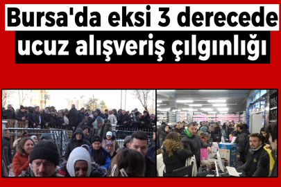 Bursa'da eksi 3 dereceyi bulan dondurucu soğuğa aldırış etmeyen vatandaşlar, açılışı yeni yapılan mağazada ucuz alışveriş için uzun kuyruk ve izdiham oluşturdu. Kuyruk metrelerce uzarken, 100 liradan bavul, kamp sandalyesi, çorba seti ve bardak seti 500 liradan halılar kapışıldı.