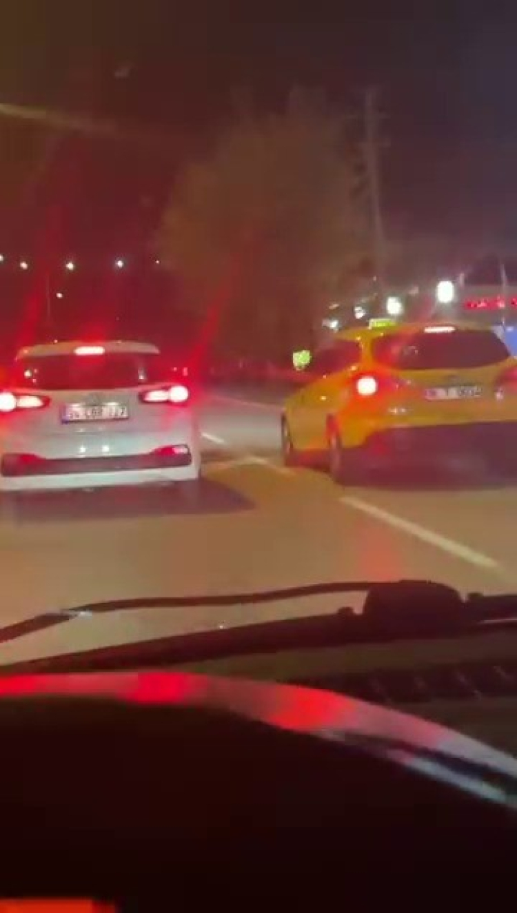 Öte yandan, yaşanan kovalamacada taksiden inen bir kişinin ise, korsan taşımacılık iddiası ile kovaladıkları şahsın aracına tekme atmaya çalışması kameraya anbean yansıdı.
