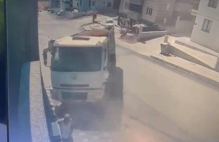 Kaza, saat 15.43'te Fatih Mahallesi Aşık Veysel Caddesi'nde meydana geldi. Yusuf K. (45) yönetimindeki 49 DC 275 plakalı kum yüklü kamyonun yokuş aşağı geri giderken freni patladı. Sürücünün kontrolünden çıkan araç hızla gitmeye başladı. Sürücü hızlanan araçtan atlarken, araç sitenin giriş duvarına çarparak devrildi. Araç devrildiği sırada kaldırımda bulunan bir vatandaş, kaçarak saniyelerle kurtuldu. Yaralı sürücü, kaza yerine sevk edilen embulansla İnegöl Devlet Hastanesine kaldırıldı. Kaza anı bir iş yerinin güvenlik kamerasına saniye saniye yansıdı.