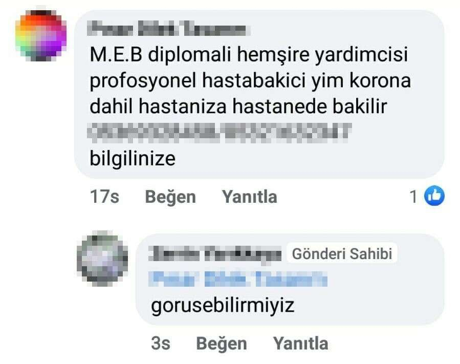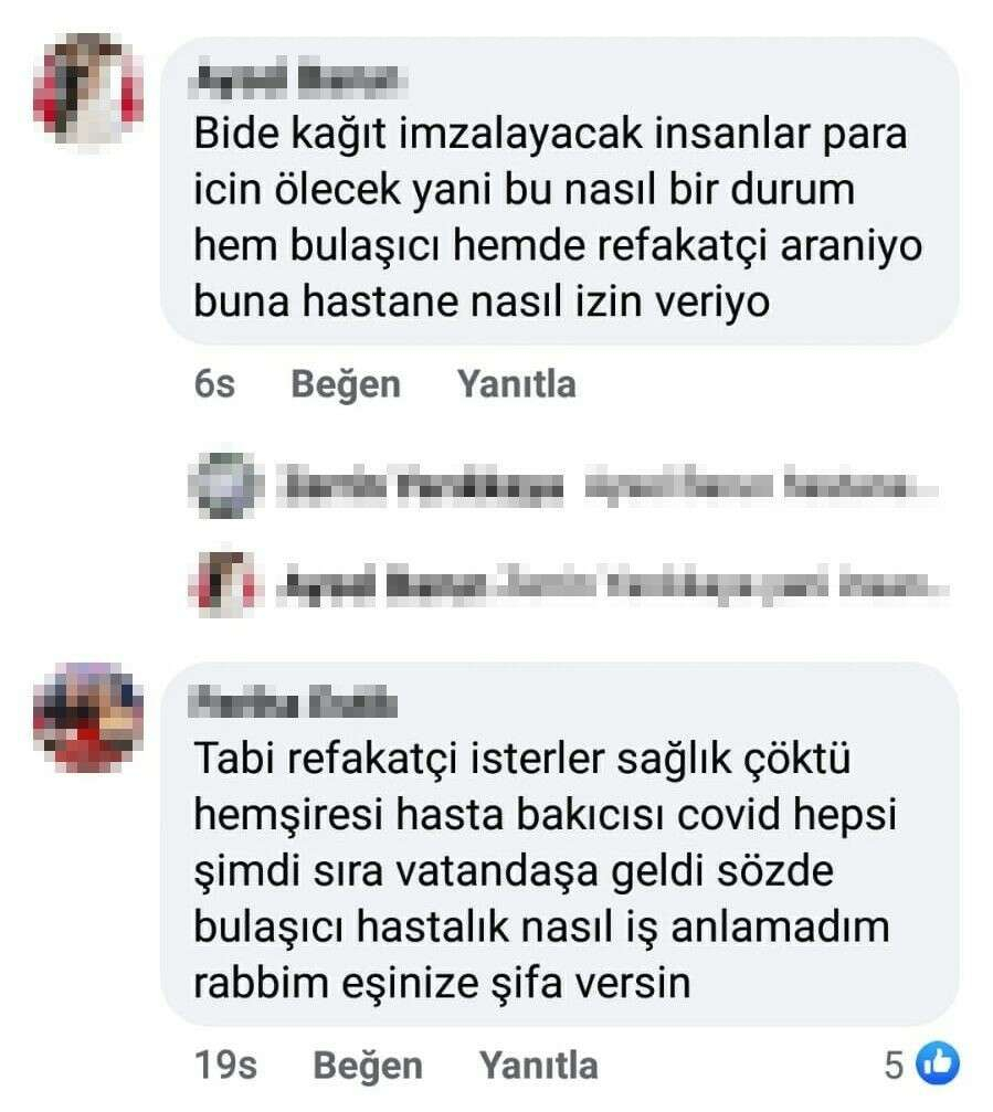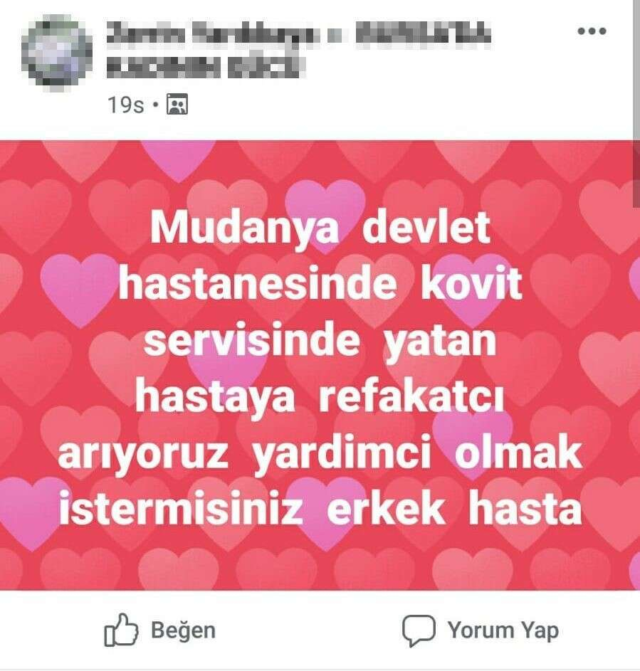 Bir kadın sosyal medya kullanıcısı tarafından grup sayfasında, “Mudanya Devlet Hastanesinde Covid-19 servisinde yatan erkek hastaya refakatçi arıyoruz, yardımcı olmak ister misiniz?” diye paylaşım yapıldı. Paylaşımın altına yapılan yorumlarda, bazı kullanıcılar ilana tepki gösterirken, bazılarının ise “ücrette anlaşabilirsek ben kalabilirim” yazması dikkatleri çekti.