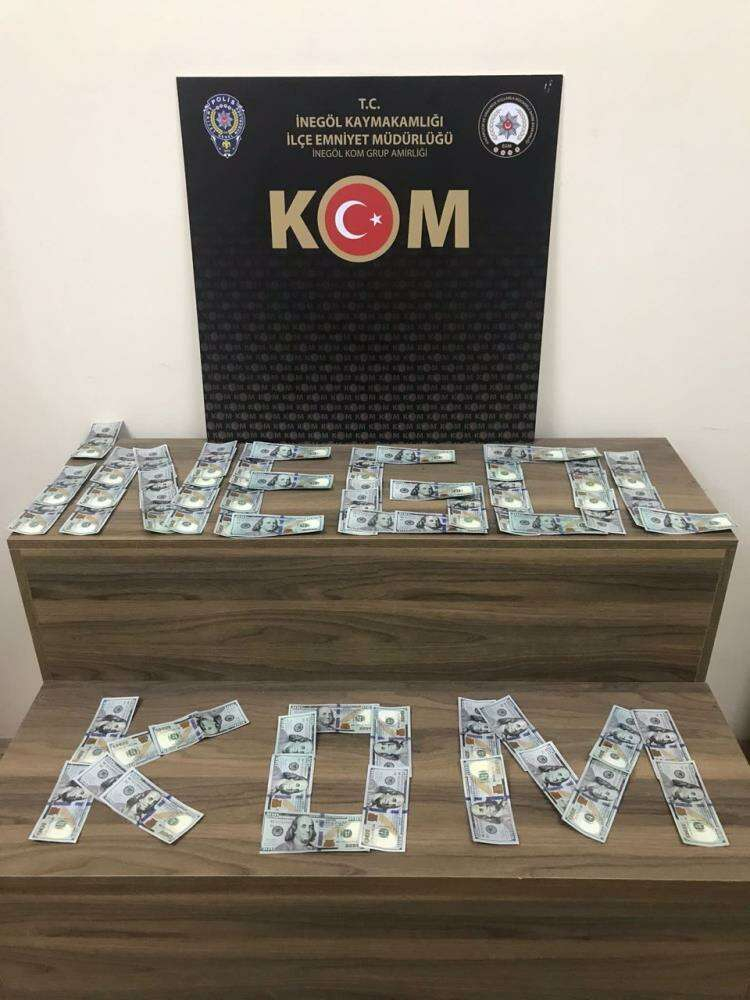 Piyasaya sahte dolar sürmeye çalışan Memduh T. isimli şahıs, İnegöl ilçesi İnegöl KOM Grup Amirliği ekipleri tarafından yapılan operasyon sonucu yakalandı. Şüphelinin ikametinde yapılan aramalarda, 62 adet 100 dolar olmak üzere toplamda 6 bin 200 sahte Amerikan doları ele geçirildi. Ayrıca, şüphelinin yapılan GBT sorgusunda dolandırıcılık ve kasten yaralama suçundan 17 yıl kesinleşmiş hapis cezası olduğu, aynı zamanda resmi belgede sahtecilik ve dolandırıcılık suçlarından 4 ayrı mahkemece arandığı tespit edildi. Şüpheli Memduh T., İnegöl Adliyesinde çıkarıldığı mahkemece tutuklanarak cezaevine gönderildi.