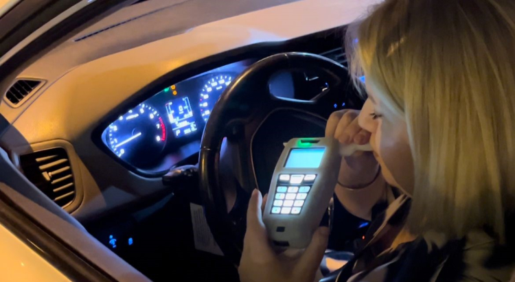 Alkolmetreyi kendi eline alan Hüsne Ş., son denemede başarılı olunca 0.89 promil alkollü olduğu ortaya çıktı.