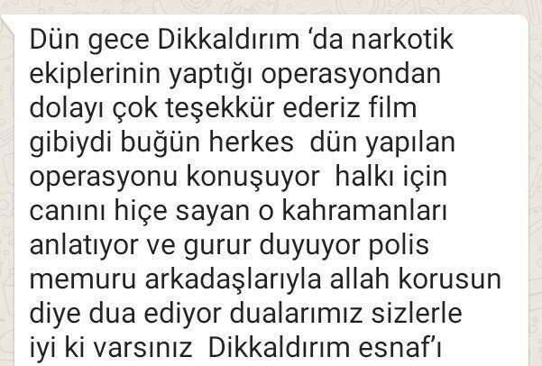 Eş zamanlı yapılan uyuşturucu operasyonlarının ardından NARKO-TEM WhatsApp ihbar hattına teşekkür mesajı yağdı. Mahalle sakinleri film gibi uyuşturucu operasyonunun ardından polislere teşekkür etmek için NARKO-TEM'e yazdı. Mahalle esnafı, "Dün gece Dikkaldırım'da narkotik ekiplerinin operasyondan dolayı çok teşekkür ederiz. Film gibiydi, bugün herkes yapılan operasyonu konuşuyor. Halkı için canını hiçe sayan o kahramanları anlatıyor ve gurur duyuyor. Polis memuru arkadaşları Allah korusun diye dua ediyor. Dualarımız sizlerle. İyiki varsınız Dikkaldırım esnafı" notunu paylaştı.