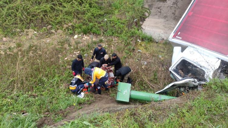 Bursa'nın Orhangazi ilçesinde virajı alamayan kamyon, karşı yönden gelen hafif ticari araca çarptıktan sonra dere yatağına uçtu. Kazada 2 sürücü de sıkıştıkları araçlardan itfaiye yardımıyla çıkarılarak hastaneye kaldırıldı.