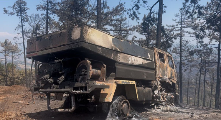 Bursa'nın Harmancık ilçesindeki orman yangınında Orman Genel Müdürlüğü'ne ait bir kamyon alevlerin arasında kalarak küle döndü. Ekipler, yangın bölgesinden son anda kaçarak canlarını zor kurtardı.