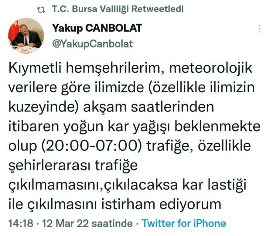 Bursa Valisi Canbolat sosyal medya hesabından, meteorolojik verilere göre yoğun kar yağışı beklendiğini kaydederek, şunları ifade etti: