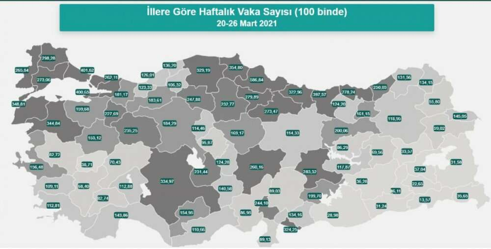 Sağlık Bakanlığı, 20-26 Mart arasında illere göre her 100 bin kişide görülen Kovid-19 vaka sayılarını açıkladı.