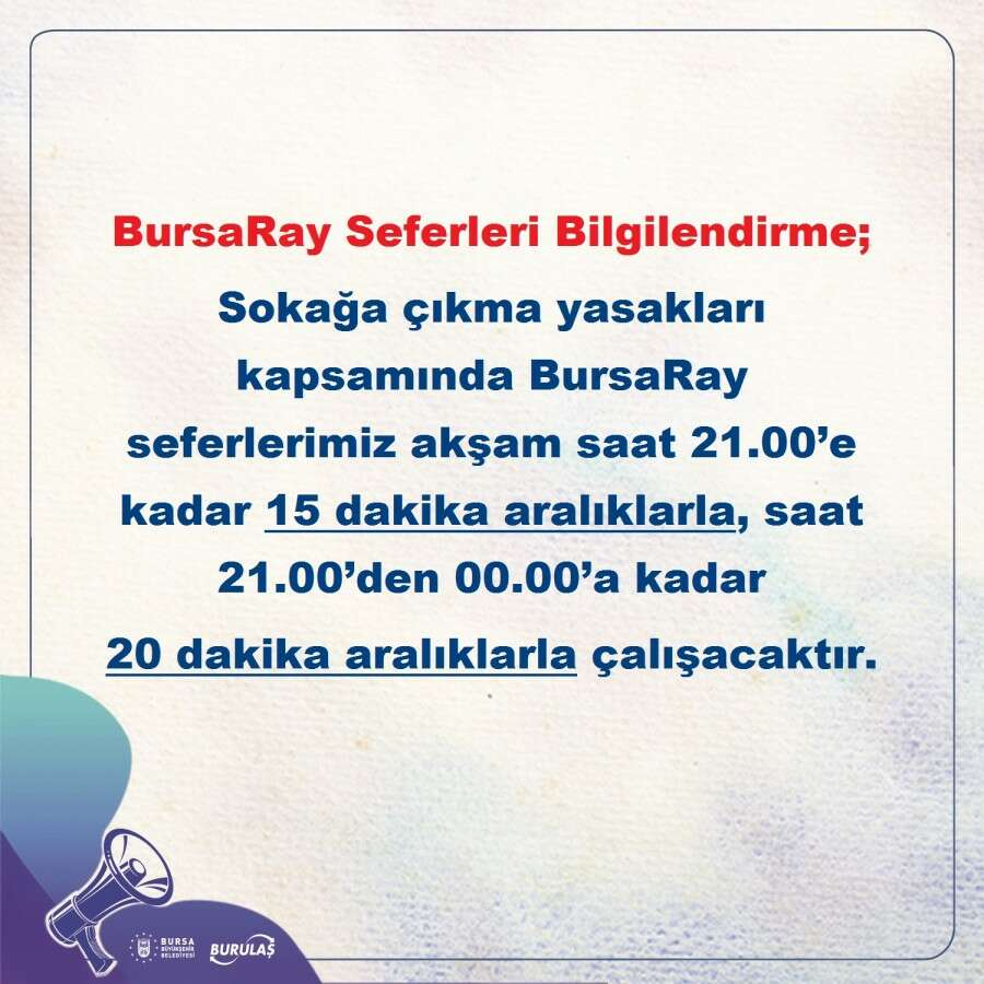 "Sokağa çıkma yasakları kapsamında BursaRay seferlerimiz akşam saat 21.00'e kadar 15 dakika aralıklarla, saat 21.00'den 00.00'a kadar 20 dakika aralıklarla çalışacaktır."
