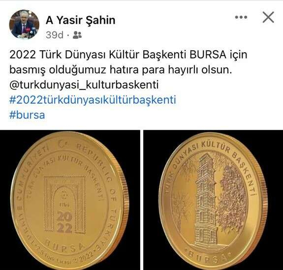 Şahin paylaşımına şu notu düştü: “2022 Türk Dünyası Kültür Başkenti BURSA için basmış olduğumuz hatıra para hayırlı olsun.”