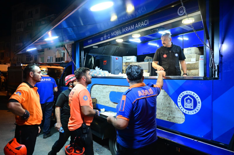 Yıldırım Belediyesi Arama Kurtarma Ekibi, AFAD koordinasyonunda yürütülen çalışmalara katılarak, yıkılan binanın enkazındaki depremzedeleri kurtarmak için seferber oldu. Ayrıca Yıldırım Belediyesi Sosyal Destek Hizmetleri Müdürlüğü de bölgeye bir adet mobil ikram aracı ve personel sevk ederek, afetzede vatandaşlara çorba, sandviç, çay ve su ikramı yaptı.