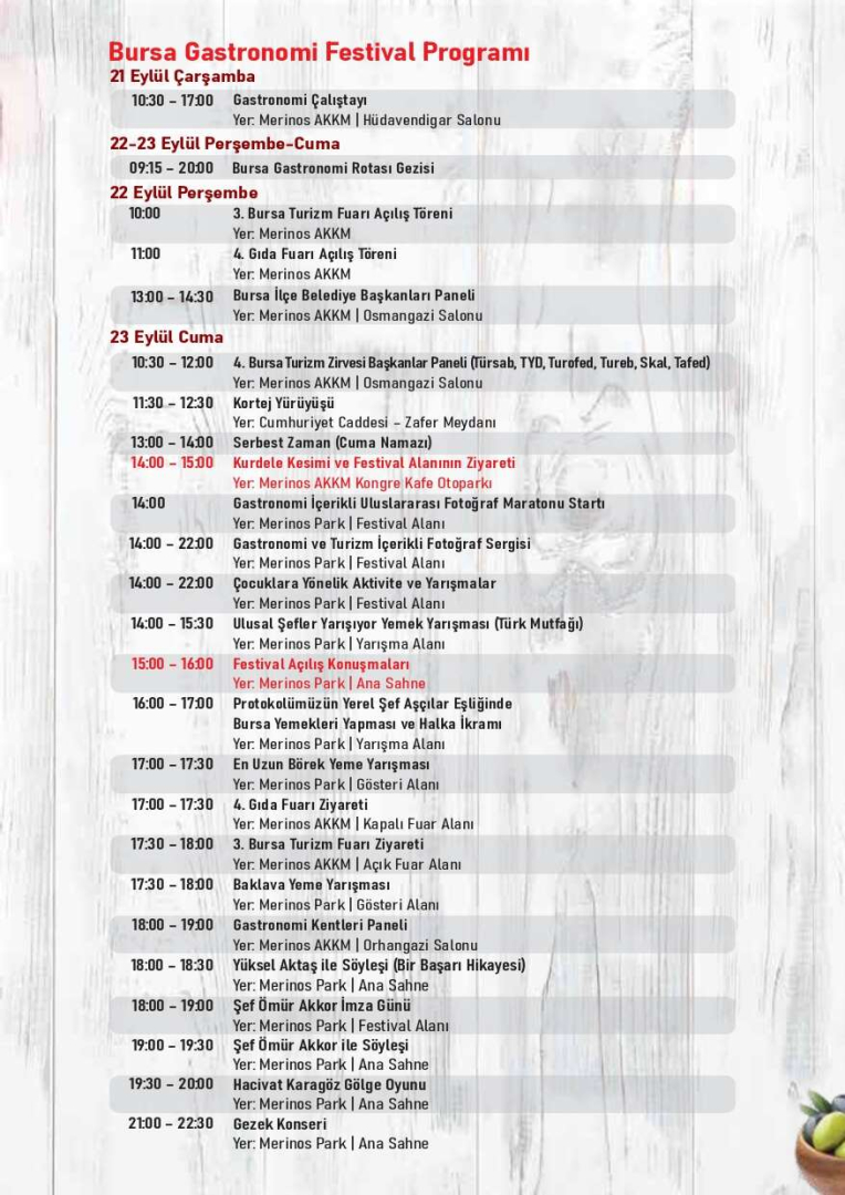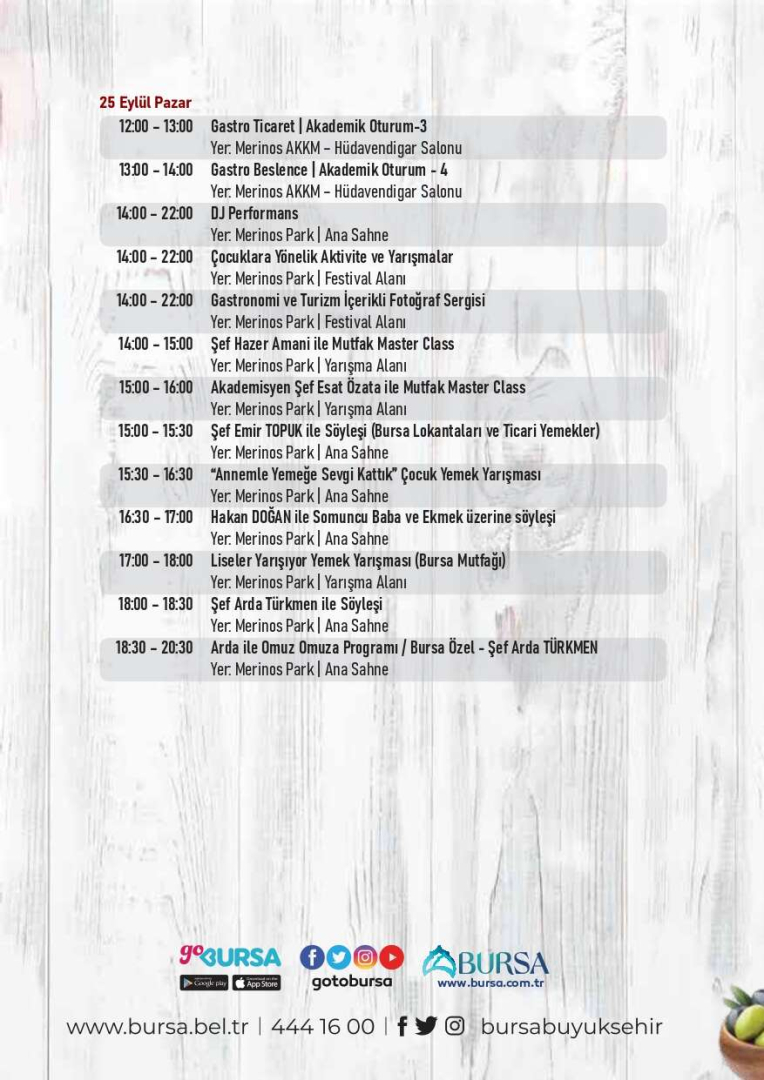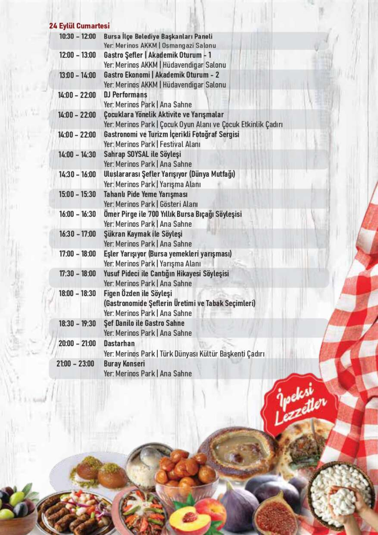 Bursa’nın gastronomi kültürünü ortaya çıkarmak amacıyla zengin bir içerikle hayata geçirilecek Gastronomi Festivali’nde eğitimler, çalıştaylar, paneller, söyleşiler, alım heyetleri, B2B’ler, konserler ve gösteriler yer alacak. Ayrıca festivalle eş zamanlı olarak Ulusal İhtisas Fuarı niteliğindeki 4. Gıda (TURFOOD) Fuarı ve 3. Turizm Fuarı gerçekleştirilecek. Ulaşımın kolay olması nedeniyle festival Merinos Park’ta düzenlenecek. Festival süresince ana sahnede gastro showlar, lezzet hikayelerinin anlatıldığı söyleşiler, ödül törenleri ve konserler organize edilecek. Yarışma çadırında, halka ve sektörün profesyonellerine yönelik birçok yarışma yapılacak. Festival süresince belirlenen oyun alanları, parkurlar, çeşitli aktivite ve yarışmalarla çocuklar da keyifli zaman geçirecek. Birçok ünlü isim de festival boyunca Bursalılarla birlikte olacak. Sanatçı Buray, Şef Danilo Zanna, Şef Hazer Amani, Şef Arda Türkmen, Şef Ömür Akkor, Akademisyen Şef Esat Özata, Sahrap Soysal, Şükran Kaymak ve daha birçok ünlü isim festivalde yer alacak.