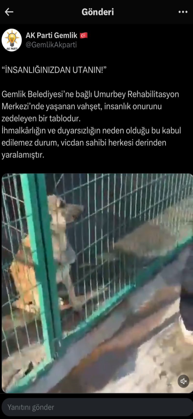 Kamuoyunda infiale neden olan görüntüler hakkında açıklama yapan MHP Gemlik İlçe Başkanı Emrah Keskinden, "Bugün Gemlik Belediyesi'nin sorumluluğunda olan Umurbey Geçici Hayvan Rehabilitasyon Barınağı'nda dehşet verici görüntüler ortaya çıkmıştır. Barınakta bulunan hayvanların bakımsızlık, ilgisizlik, açlık içerisinde kalması ve kilitli kafeslere kapatılması sonrasında birbirlerine saldırdıkları ve içlerinde yer alan bir hayvanı parçalayarak beslenmeye çalıştıkları tespit edilmiştir. Tamamen Gemlik Belediyesi ve Belediye Başkanı Şükrü Deviren'in himayesinde yaşanan bu vahşet artık sınırları aşmış ve sabrımızı taşırmıştır. Gemlik'in uluslararası itibarı yaşananlarla her gün zarar görmektedir. Gemlik Belediyesini oyun parkına çeviren, yap boz yöntemiyle idarecilik yaptığını zanneden iş bilmezlere yakışan bu saatten itibaren onurlu bir şekilde görevi bırakmasıdır" dedi.