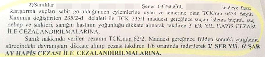 2011 yılında başlayan Dava 2016 yılında tamamlandı. Bursa 1. Ağır Ceza Mahkemesi Şevket Yılmaz Devlet Hastanesi 2014/405 esas sayılı kantin ihalesine fesat karıştırılmasıyla ilgili davanın karar duruşmasını 09.06.2016 tarihinde yapıldı. Sanıklara ceza yağarken kararda Eski Bakan Faruk Çelik’in öz yeğeni Şener Güngör ve sanıklarla ilgili karar metninde, “İhaleye fesat karıştırma suçları sabit görüldüğünden eylemlerine uyan ve lehlerine olan TCK’nın 6459 Sayılı Kanunla değiştirilen 235/2-d delaleti ile TCK 235/1 maddesi gereğince suçun işleniş biçimi, suç sebep ve saikleri, sanığın kastının yoğunluğu dikkate alınarak takdiren 3’er yıl hapis cezası ile cezalandırılmalarına, sanık hakkında verilen cezanın TCK’nun 62/2. Maddesi gereğince fiilden sonraki yargılama süresince davranışları dikkate alınıp cezası takdiren 1/6 oranında indirilerek 2’şer yıl 6’şar ay hapis cezası ile cezalandırılmalarına” hükmetti.