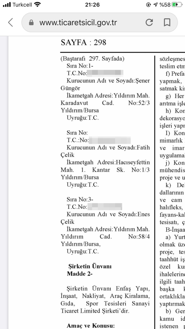 Öz yeğen Şener Güngör’ün ceza almasıyla birlikte ENFAŞ İnşaat’taki ortakları Faruk Çelik’in oğlu Enes ve Osman Çelik’in oğlu Fatih Çelik ortaklıktan çekilmiş.