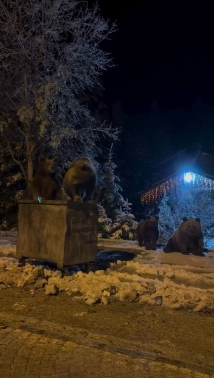 Bursa Uludağ'da yerleşim alanlarına inen ayılar, çöp konteynerlerinin üzerinde dolaştı. Çöp konteynerini karıştıran 1 anne ve 3 yavru ayının, bölgede kar yağmasına rağmen hala kış uykusuna yatmamaları dikkat çekti.
