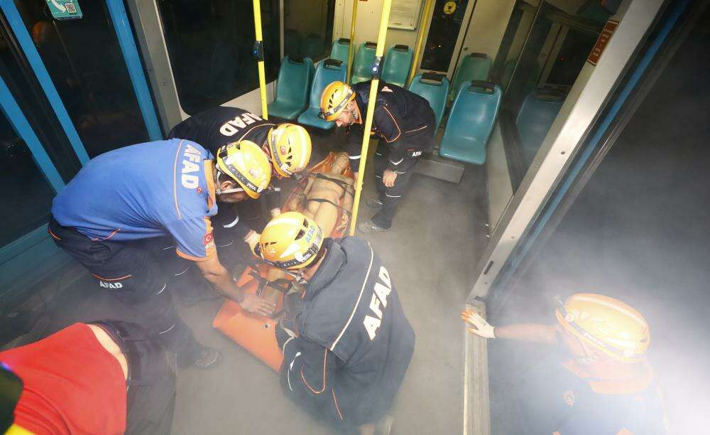Bursa Büyükşehir Belediyesi, bir taraftan raylı sistem başta olmak üzere toplu taşıma araçlarında konforu artıracak adımları atarken diğer taraftan yolcu güvenliğini en üst seviyeye çıkarmak için kazaların en az zararla atlatılmasına çalışıyor. Bu çerçevede kent içi toplu taşımada en büyük yükü çeken raylı sistem hattında yangın tatbikatı gerçekleştirildi. Gece saat 02.00’da yapılan tatbikatta, senaryo gereği Üniversite - Arabayatağı seferini yapan metroda ‘Osmangazi İstasyonu ile Şehreküstü İstasyonları arasındaki tünelde’ yangın çıktı. Yangın nedeniyle vagon servis dışı kalırken, vatman hemen merkezle bağlantıya geçerek durumu bildirdi. Haber gelmesi üzerine harekete geçen Büyükşehir Belediyesi itfaiyesi, AFAD ve UMKE ekipleri, vagonun kaldığı yere en yakın kaçış galerisinin bulunduğu noktaya geldi. Hattaki elektriğin kesilmesinin ardından itfaiye ekipleri, yangın söndürme çalışmasını başlattı. AFAD ve UMKE ekipleri, 2’si ağır 4 yaralıyı sedye ile vagondan çıkardı. Başarıyla tamamlanan tatbikatı yerinde izleyen Büyükşehir Belediyesi İtfaiye Dairesi Başkanı Muhammed Emin Tarım, metro hatlarında yangının pek karşılaşılan bir durum olmadığını ancak yaşandığında kötü sonuçları olabilen bir olay olduğunu kaydetti. Bu nedenle yılda en az bir kez bu tür tatbikatlarla muhtemel metro yangın ve kazalarına hazırlık yaptıklarını dile getiren Tarım, “Bu sayede hattaki durumu görmüş ve kurtarma ekiplerinin pratiği ile yangına müdahale sürecini deneyimlemiş oluyoruz. Başarılı bir tatbikat gerçekleştirdik” dedi.