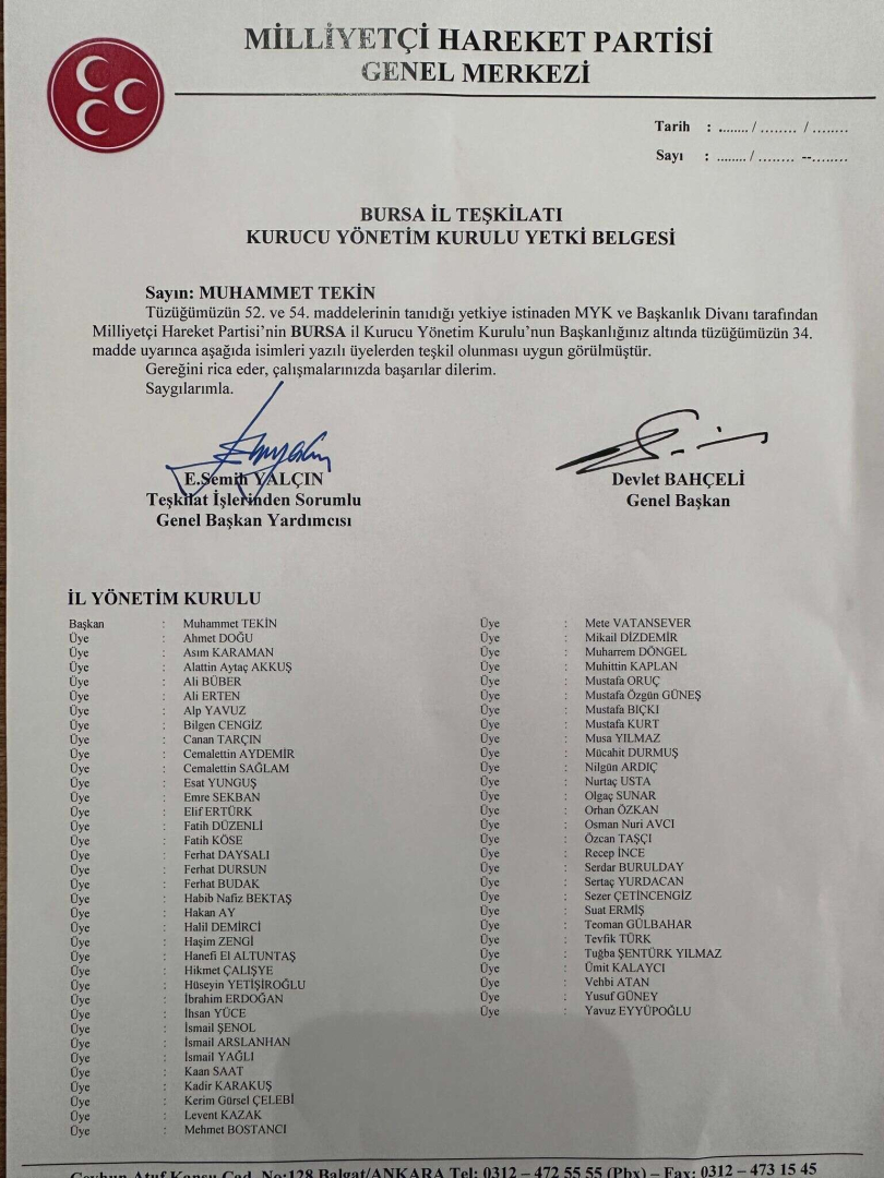 MHP Bursa'da yeni il başkanı Muhammet Tekin göreve başladı. Tekin'in yönetim kurulu listesi de belli oldu. İşte liste;