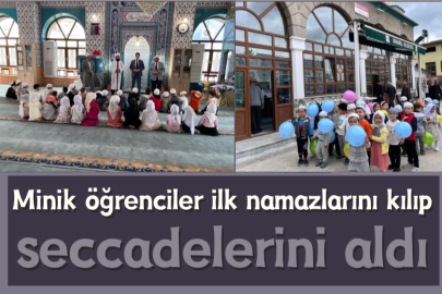 Minik öğrenciler ilk namazlarını kılıp seccadelerini aldı