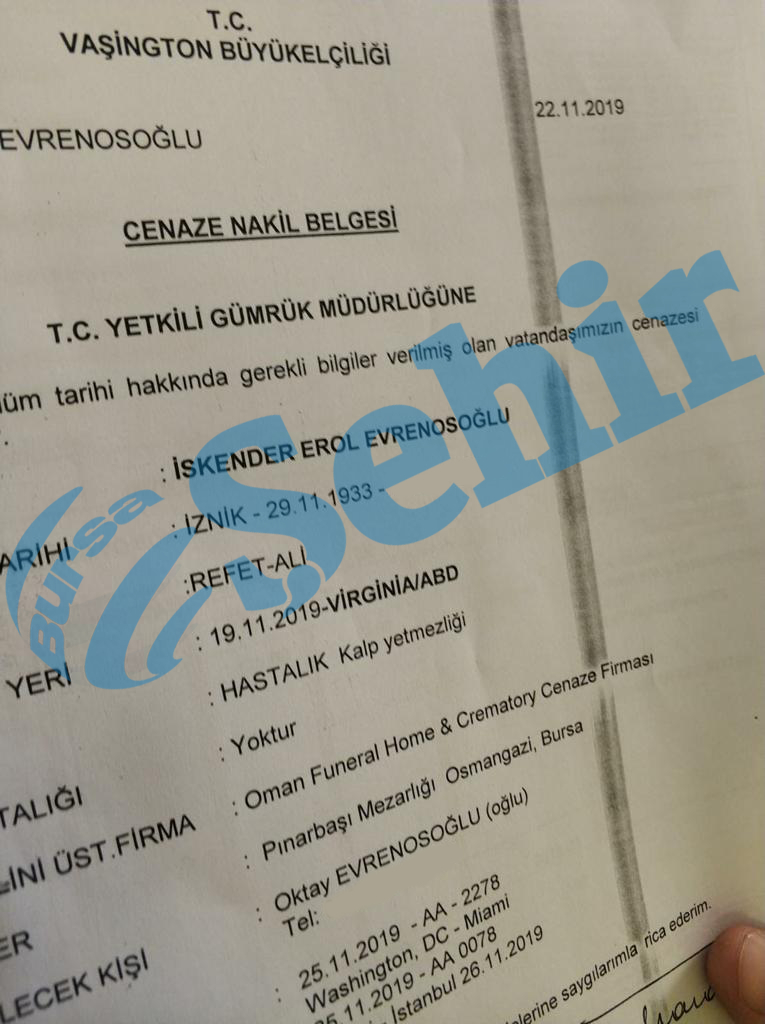 Evrenosoğlu'nun Bursa'da Hamitler Kent Mezarlığı'na gömüleceğini ilk kez Şehirmedya duyurmuştu.