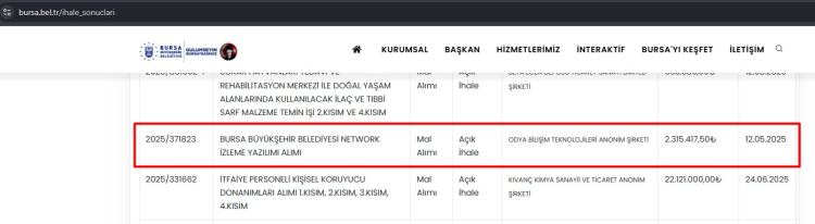 Bursa Büyükşehir Belediye Başkanlığı 12 Mayıs 2025 tarihinde “NetWork izleme yazılım ihalesi” yapıyor. 2025/371823 tarih sayılı ihalede sözleşme başlangıç tarihi de yine 12 Temmuz 2025 olarak kayıtlara geçiyor. Tüm Bursa’nın bilgilerine ulaşma imkanı sağlayan NetWork izleme işini İstanbul merkezli ODYA Bilişim firması alıyor. Ancak bu kadar hayati ve kritik öneme sahip ihaleyi yapan Büyükşehir Belediyesi, ilgili firmanın İsrail bağlantısını umursamıyor. Bu kadar kritik bir iş için çıkılan ihalede firmaların araştırmasının yapılmaması mümkün değil. Eğer araştırılmadıysa o daha da büyük bir skandal.