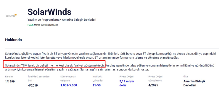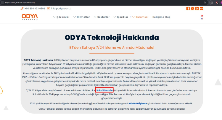 Türkiye için en büyük tehditlerden birisi olan İsrail, en büyük düşman durumunda. CHP’nin yıllardır İsrail firmalarıyla ticaretin devam ettiği algı operasyonları göz önünde bulundurulduğunda, CHP’li belediyelerde üst üste patlak veren casusluk girişimleri akıllarda ciddi kuşkular bırakıyor. İşte Büyükşehir Belediyesi’nin tüm Bursa’nın bilgilerine ulaşma hakkı tanıdığı ODYA Bilişim de İsrail bağlantılı bir kuruluş ve açık kaynaklarda İsrail merkezli Solar Winds’in Türkiye temsilciliğini yaptığı yer alıyor.