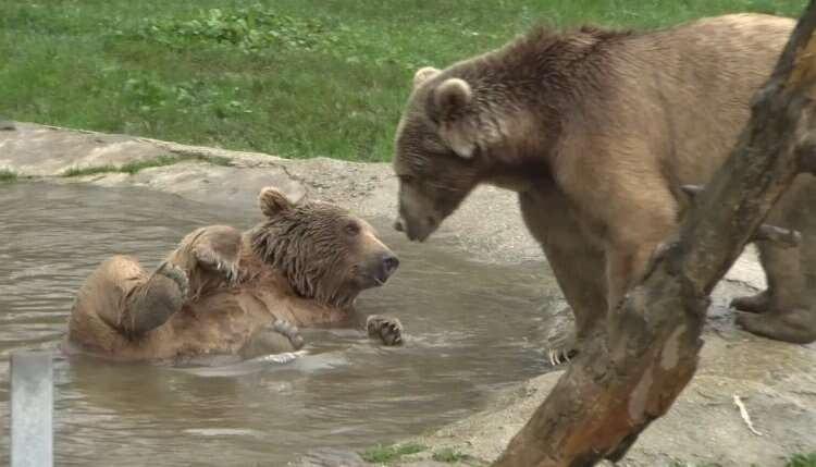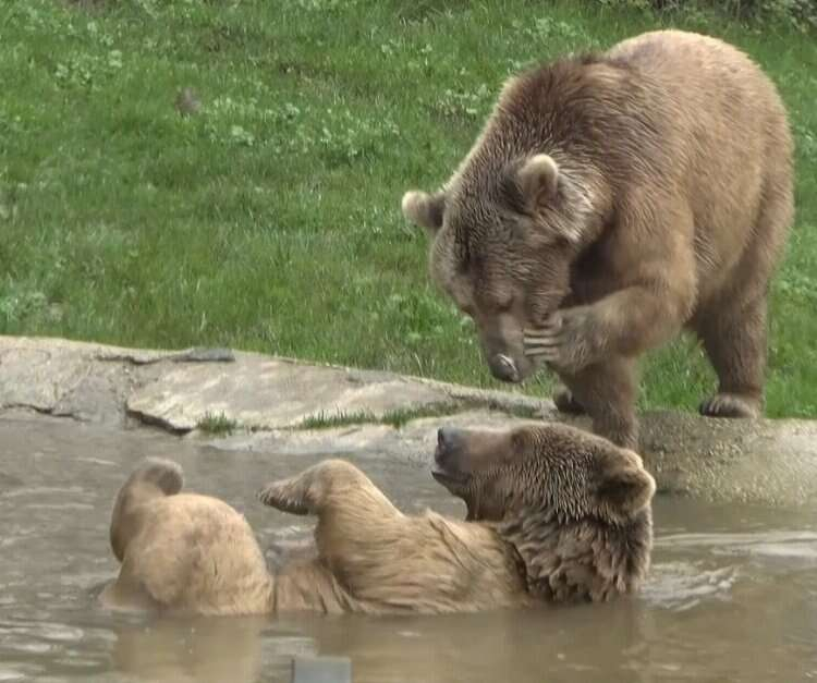 Dünya Uyku Günü'nde kış uykusundan uyanan ayılar önce güreşip ardından banyo keyfi yapıyor.