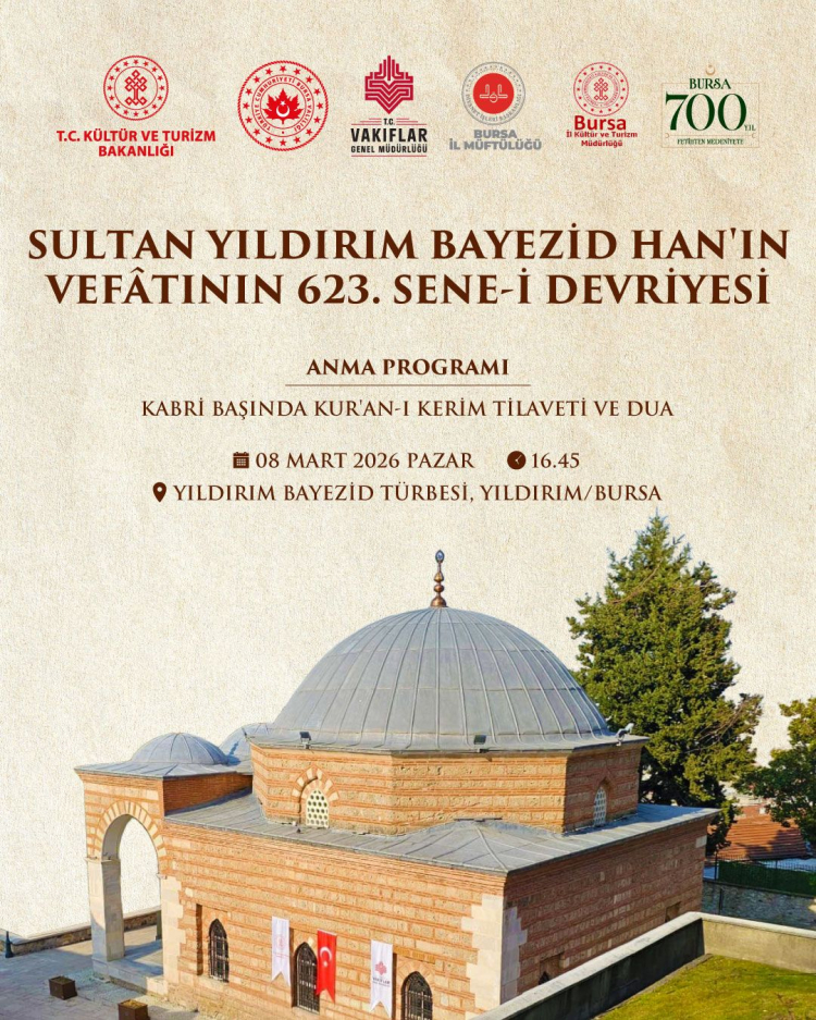 Anma programı, 8 Mart 2026 Pazar günü ikindi namazının ardından Yıldırım Camii’nde başlayacak ve daha sonra Yıldırım Türbesi’nde kabri başında Kur’an-ı Kerim tilaveti ve dualarla devam edecek.