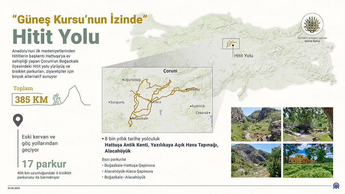 Hitit yolu yürüyüş ve bisiklet parkurları, yürüyüşçülere UNESCO Dünya Kültür Mirası listesinde yer alan Hattuşa Ören Yeri ile bölgedeki diğer önemli Hitit yerleşimleri Alacahöyük ve Şapinuva arasındaki eski yollarda seyahat etme fırsatı sunuyor.