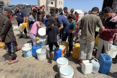 Gazze'nin güneyindeki Han Yunus kentindeki Filistinliler, bir su tankerinin dağıttığı suları bidonlara doldurup günlük su ihtiyaçlarını karşılamaya çalışıyor.