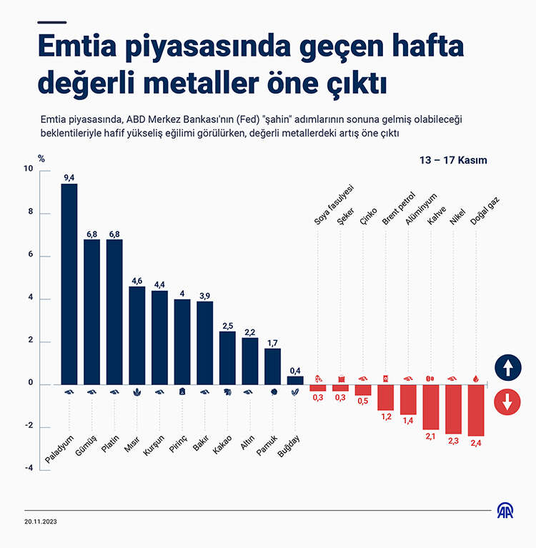 Geçen hafta değerli metallerdeki yükselişler öne çıktı. Haftayı altın yüzde 2,2, gümüş yüzde 6,8, platin yüzde 6,8 değer kazancıyla tamamladı. Önceki haftalarda sert düşen paladyum da geçen hafta yüzde 9,4 arttı.