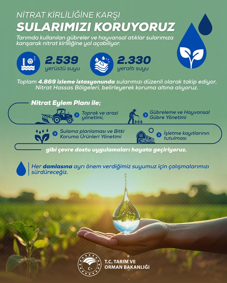 Her damla suyun yarınların teminatı olduğuna dikkati çeken Yumaklı, "Tarımsal faaliyetlerden kaynaklanan nitrat kirliliğini önlemek amacıyla 4 bin 869 izleme istasyonunda su kalitemizi düzenli olarak takip ediyoruz. Toprak ve arazi yönetiminden gübre kullanımına kadar çevre dostu uygulamalarla sularımızı koruyor, geleceğimizi güvence altına alıyoruz." ifadelerini kullandı.