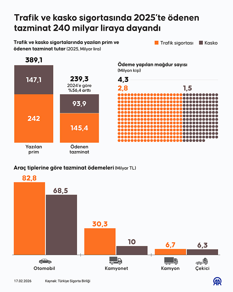 AA muhabirinin, Türkiye Sigorta Birliğinin (TSB) 2025 yılına ilişkin Motorlu Taşıtlar Sigorta İstatistikleri'nden derlediği bilgiye göre, trafik ve kasko sigortalarında ödenen tazminatlar arttı.