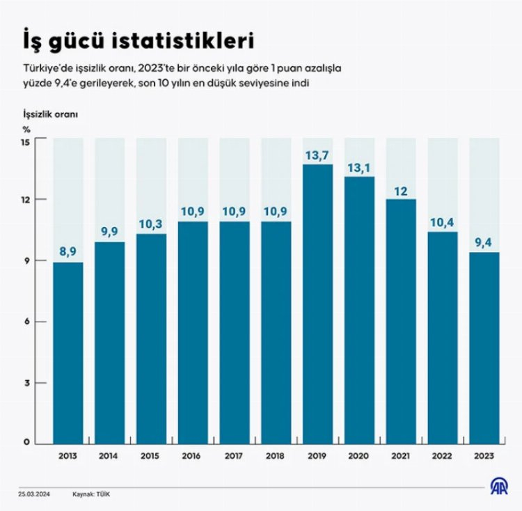Türkiye İstatistik Kurumu ve Avrupa İstatistik Ofisi verilerinden yapılan derlemeye göre, Türkiye'de geçen yıl işsiz sayısı, bir önceki yılın aynı dönemine kıyasla 318 bin kişi azalarak 3 milyon 264 bin kişi oldu. Bu dönemde işsizlik, bir önceki yıla göre 1 puan düşerek yüzde 9,4'e geriledi.
