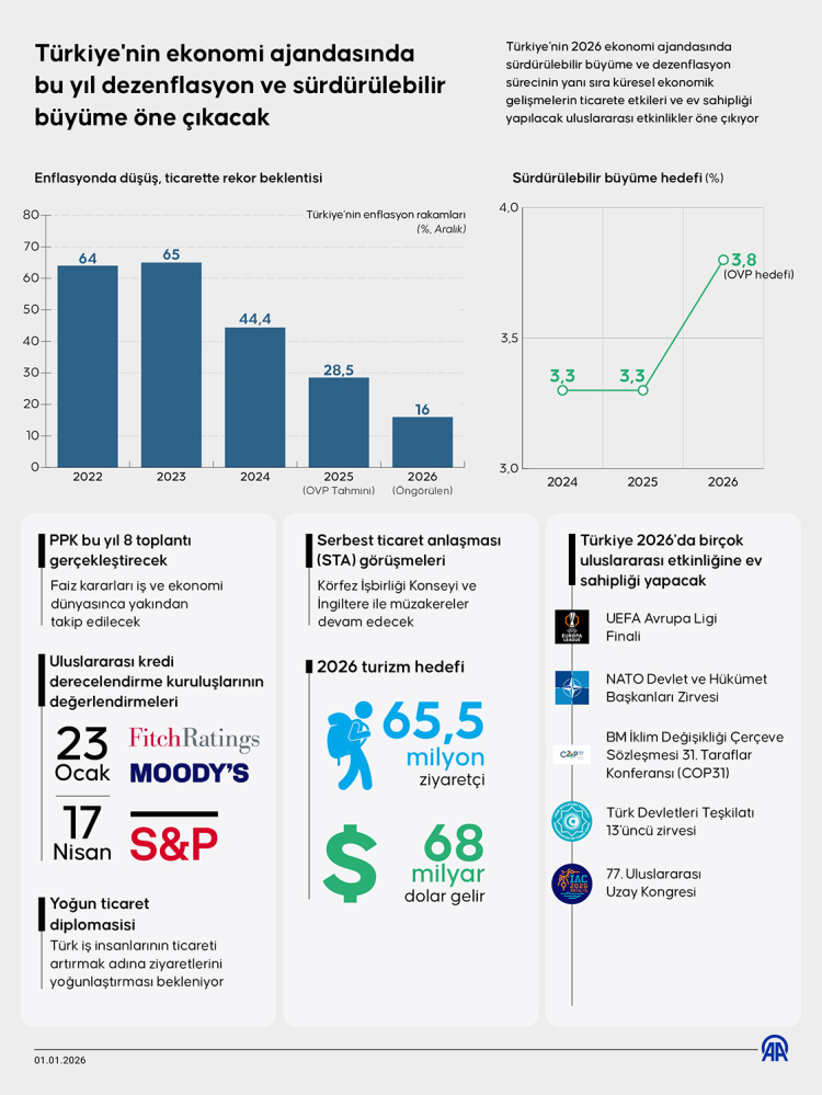 AA muhabirinin derlediği bilgiye göre, Türkiye'nin 2026 ekonomi ajandasında sürdürülebilir büyüme ve dezenflasyon sürecinin yanı sıra küresel ekonomik gelişmelerin ticarete etkileri ve ev sahipliği yapılacak uluslararası etkinlikler öne çıkıyor.