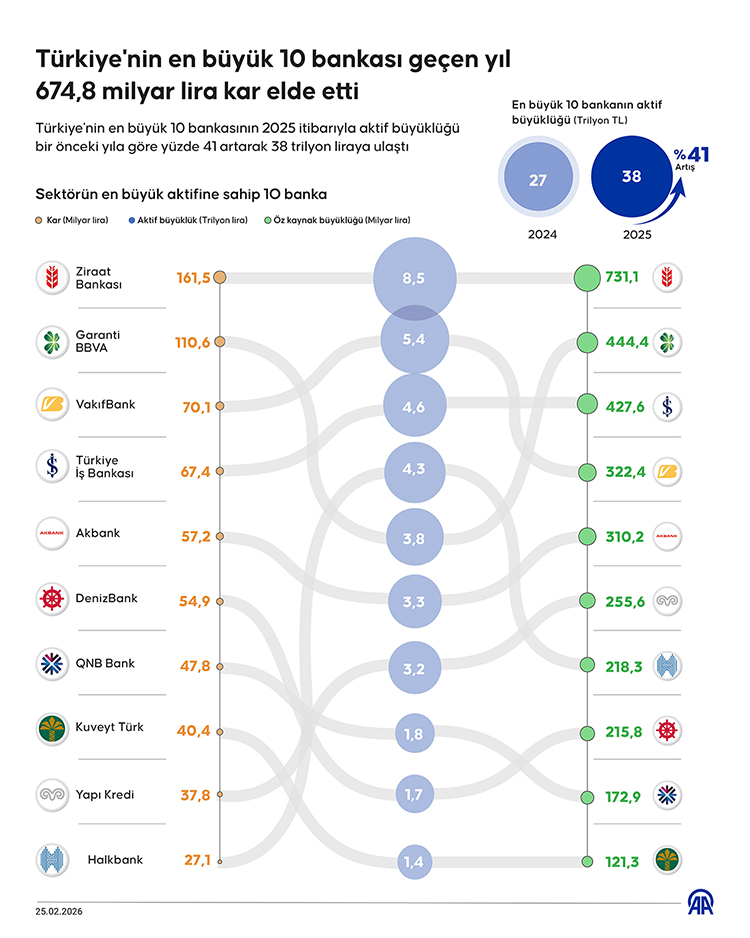 AA muhabirinin, bankaların konsolide olmayan finansal tablolarından derlediği bilgiye göre, 2025 yılında Ziraat Bankası, VakıfBank, Türkiye İş Bankası, Halkbank, Garanti BBVA, Akbank, Yapı Kredi, QNB Bank, Denizbank ve Kuveyt Türk ülkede en yüksek aktif büyüklüğe sahip bankalar olarak sıralandı.