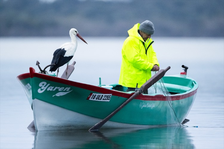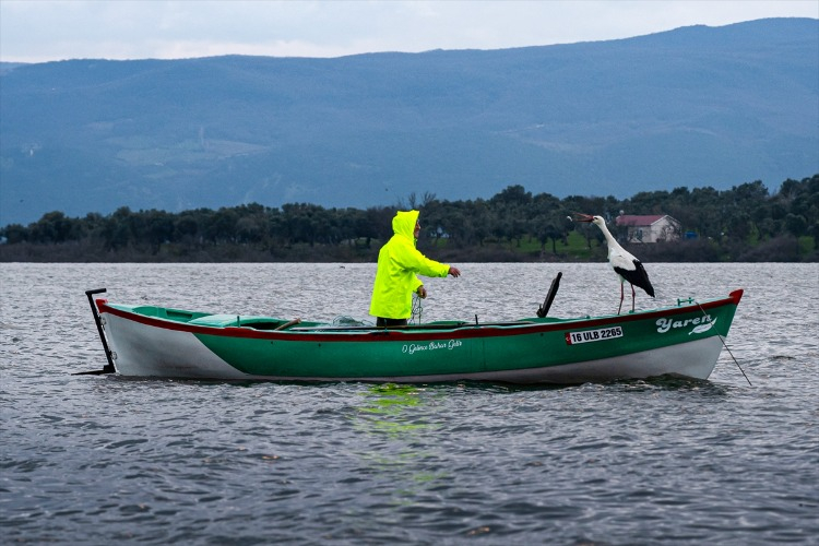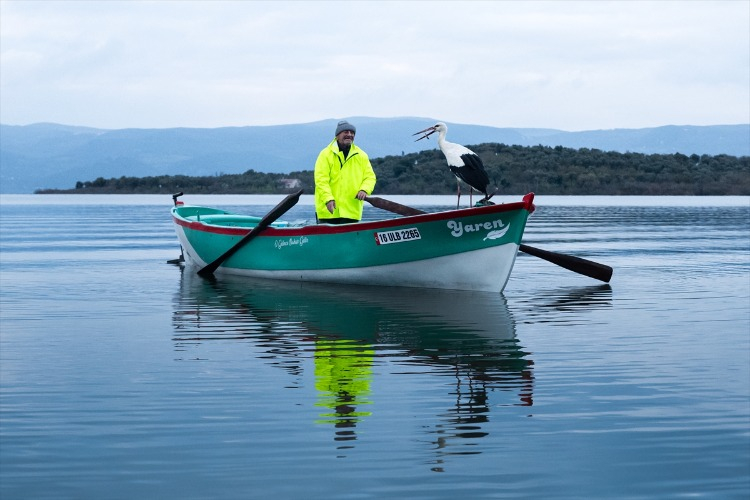 Bursa'nın Karacabey ilçesinde, Uluabat Gölü'nün kıyısındaki kırsal Eskikaraağaç Mahallesi'nin simgesi Yaren leylek, 15'inci yılda da gelip balıkçı Adem Yılmaz'ın kayığına kondu.